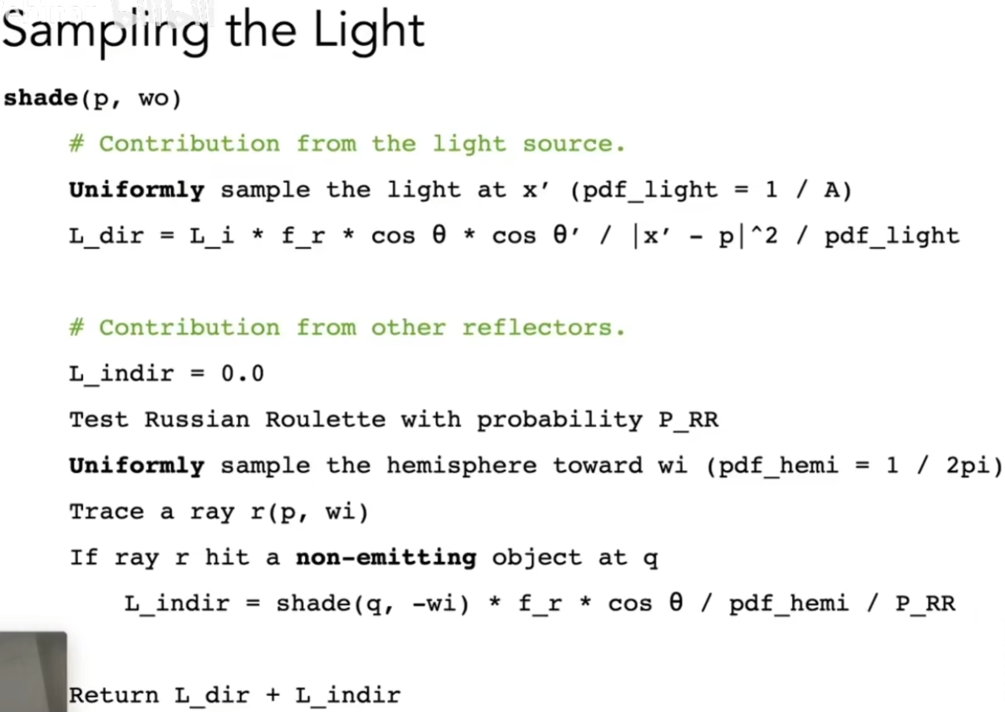 需要先理解路径追踪的原理,并且有一个整体的概念,这个不属于本教程范畴,我个人感觉,只要学过一遍LearnOpenGL,深刻理解渲染方程,然后看看Games101 https://www.bilibili.com/video/BV1X7411F744 里的Ray-Tracing章节,基本就OK了,最后的算法就一张图: