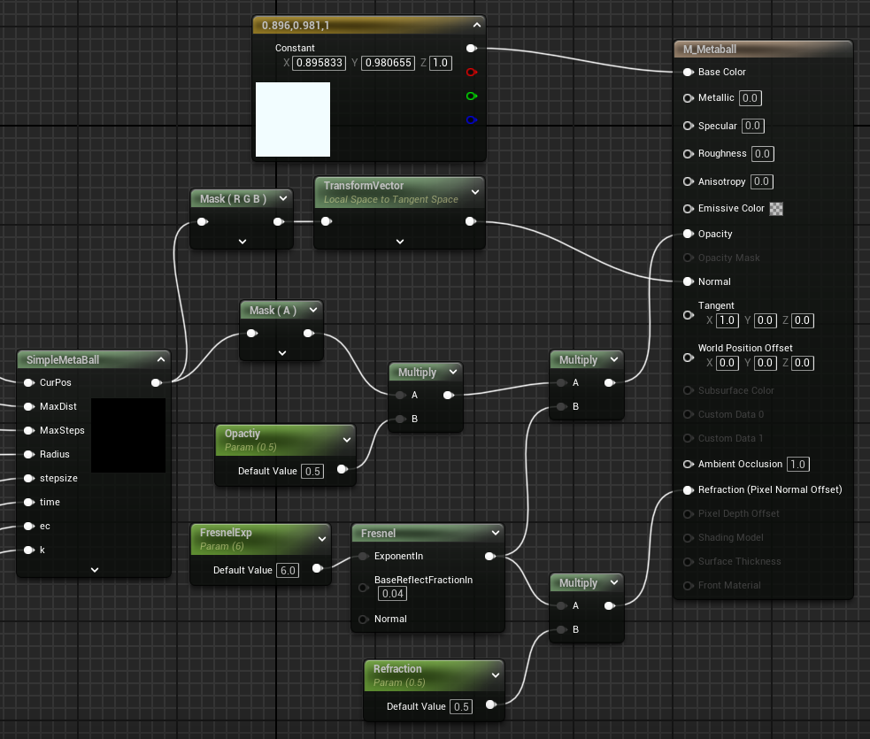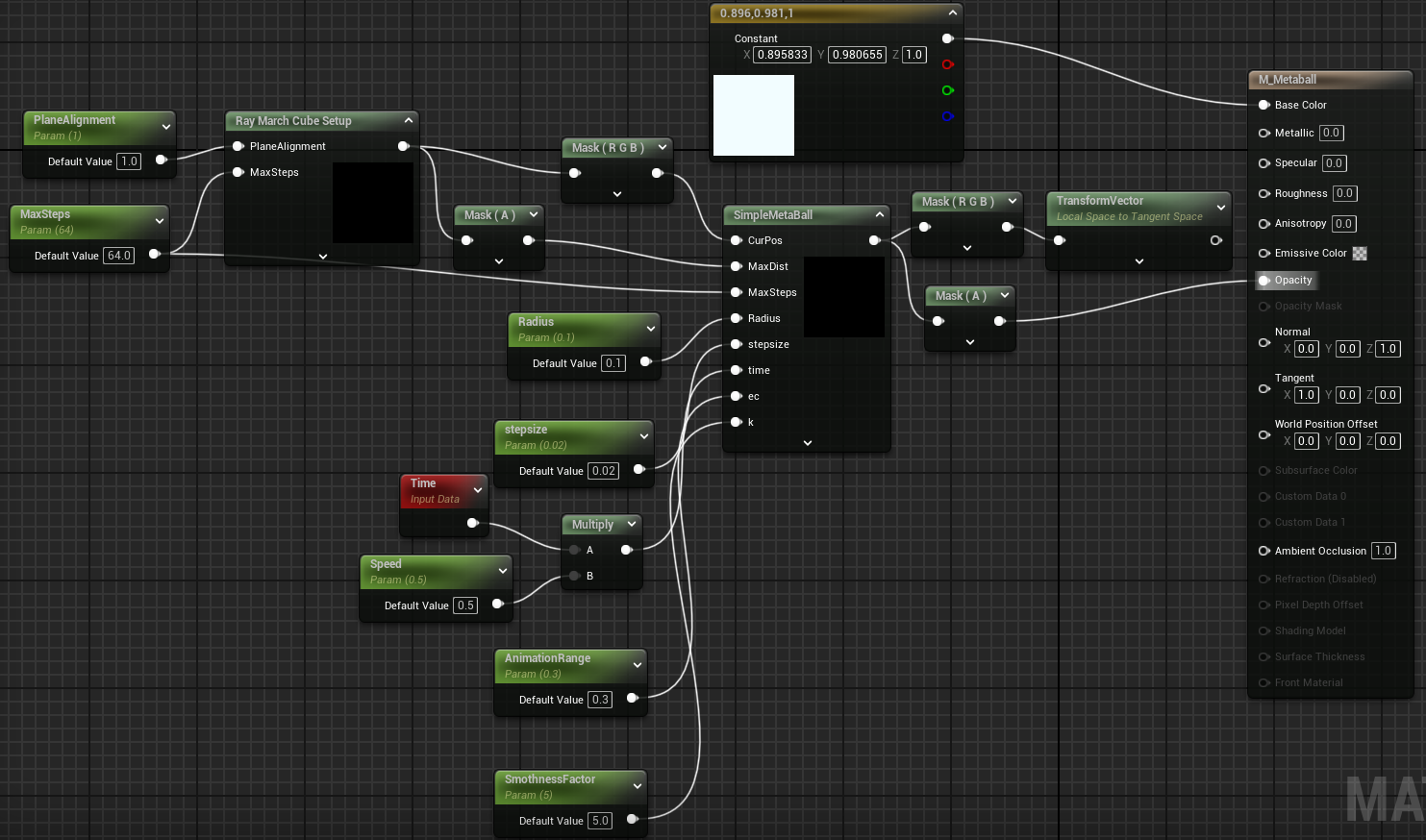 float metaball(float3 RayPos, ...) 为核心函数。计算 RayPos 这一空间点到整个Metaball聚合体的最终距离: