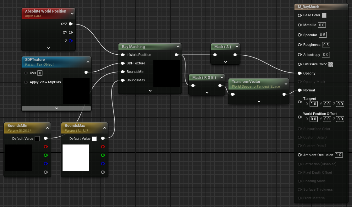 - 材质连接: 将生成的SDF体纹理和相关参数(如包围盒大小、位置等)传递给Raymarching材质