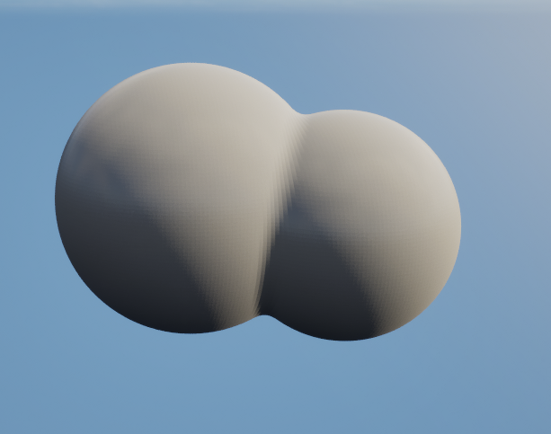 融球效果的核心原理,是隐式曲面 (Implicit Surface),这里的球体不是由顶点定义的,而是由一个场函数 f(x, y, z) 定义的。所有满足 f(x,y,z) = c 的点构成了表面,不太理解没关系,这里先使用一个单独的材质,简单模拟融球效果,建立对 SDF 和 Ray Marching 的直观概念: