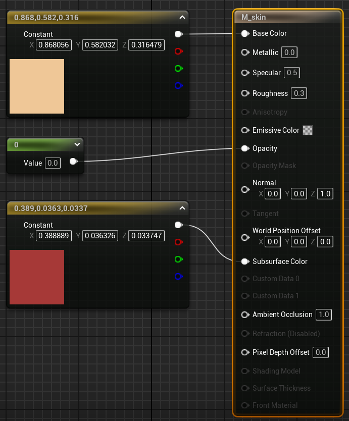 // The actual UE implementation is more complex, but this is the core idea.简单尝试一下,将材质连接为这样(三个选项依次是Surface,Opaque,Subsurface ),创建个立方体看看: