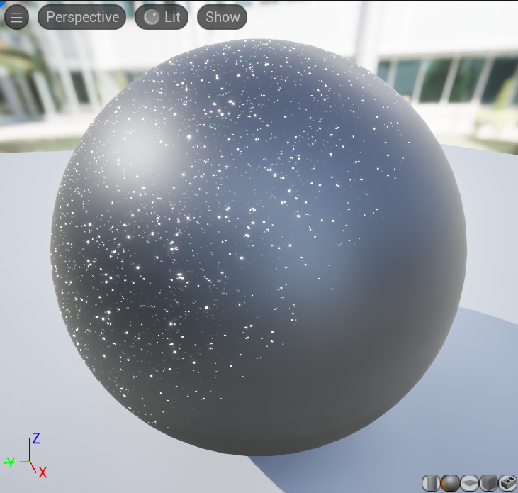 将最后的节点接入Base Color看看效果,调整视角,可以看到朝向阳光的闪光的白点: