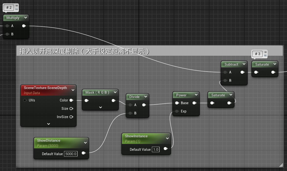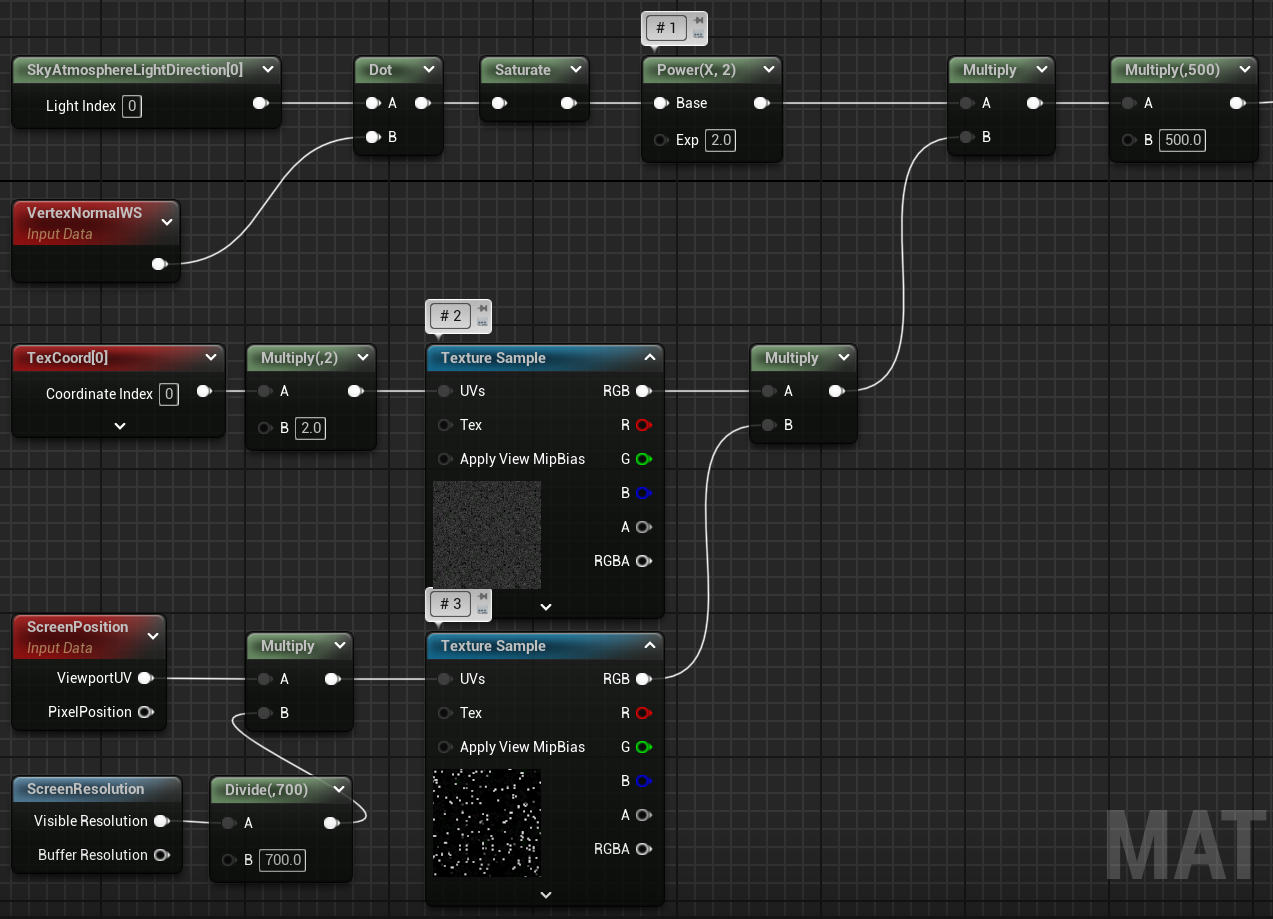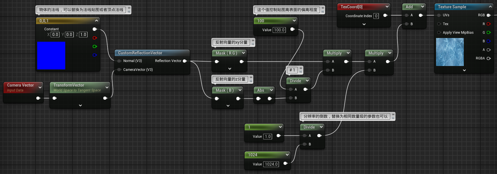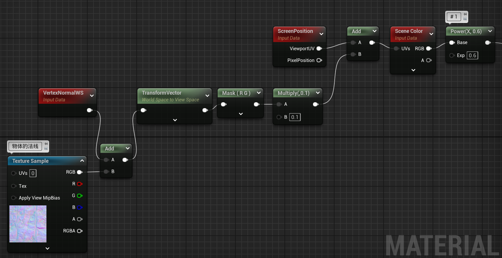 - (# 3):通过屏幕UV采样纹理,即可将纹理“固定”在屏幕上,实现特殊的视觉效果,这里除以"700"的节点可以升级为参数,来调整效果
