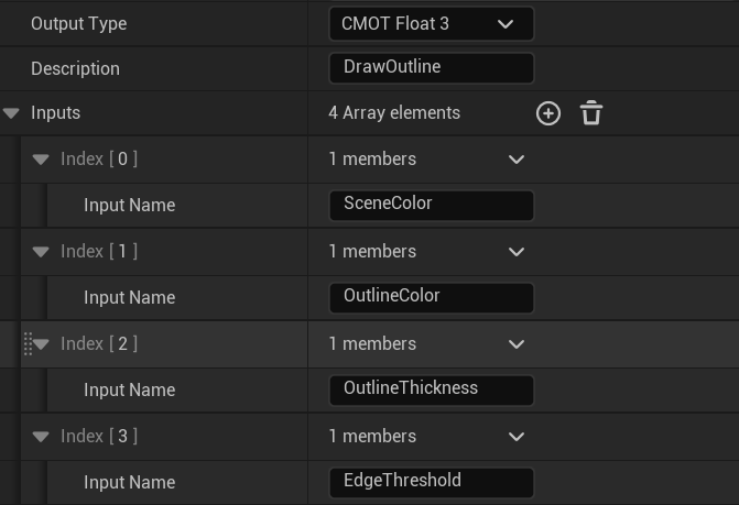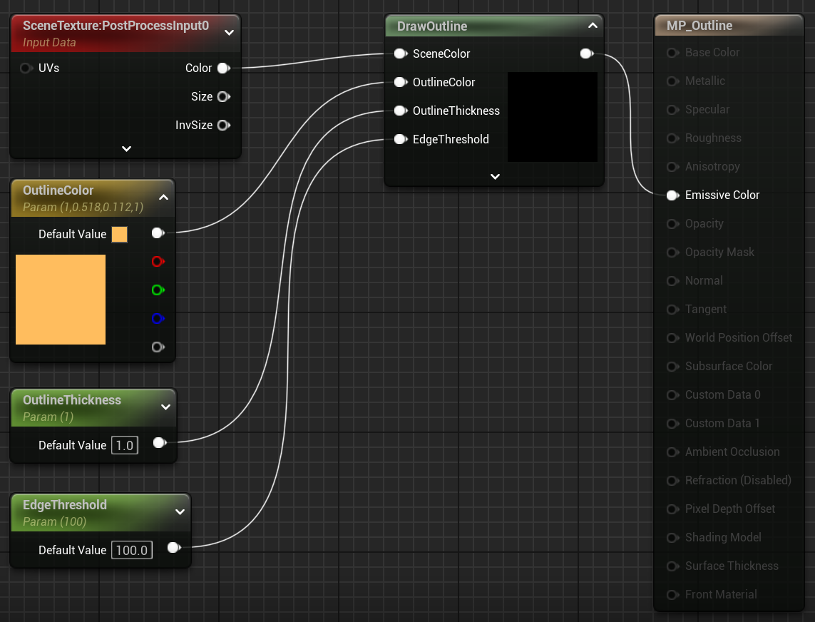 这里的"SceneTexture::PostProcessInput0"是渲染好的场景结果,一般都会将其他效果叠加在上面。然后"DrawOutline"是一个自定义节点,右键搜索"Custom"以添加,这个节点允许添加HLSL代码,一般来说后处理效果逻辑是比较复杂的,用代码会更简单清晰,我们添加下面的代码: