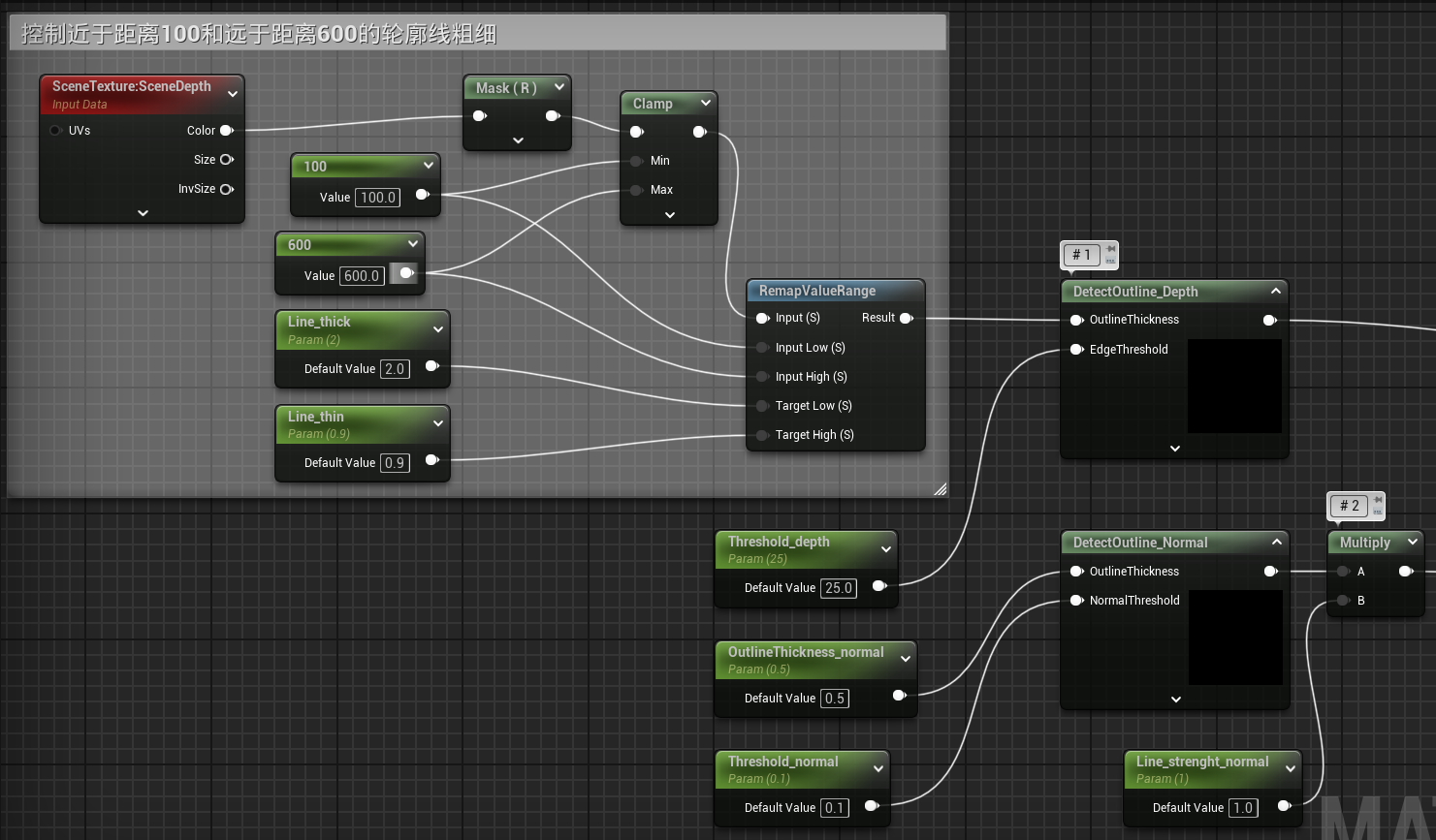 注意图中有两个边缘检测的自定义节点,DetectOutline_Depth和DetectOutline_Normal,分别是检测深度的边缘和法线的边缘,深度边缘一般是物体的外轮廓,而法线边缘则是物体的所有拐角。这里为深度检测添加了一个根据距离控制描边粗细的逻辑,不然远处的描边会看上去比较凌乱