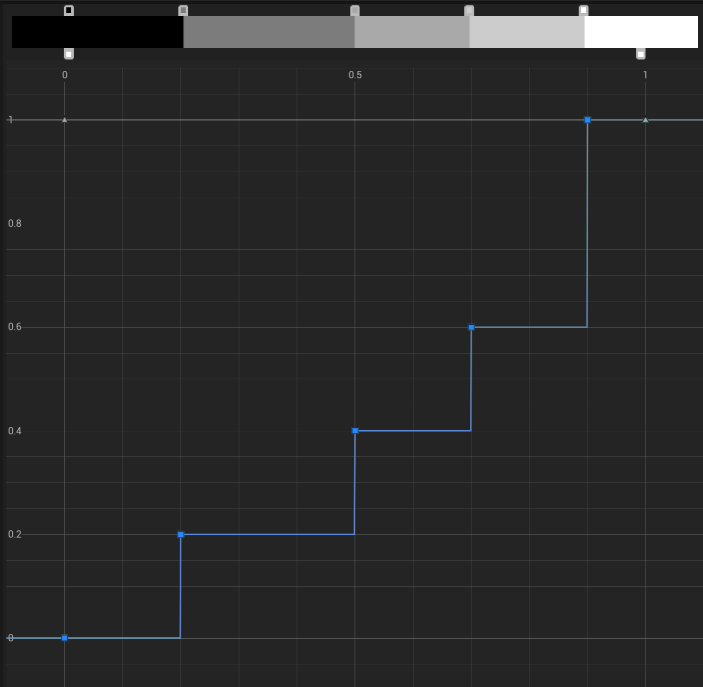 其中的ShadowStep为一个"CurveAtlasRowParameter"节点,即一个类似渐变映射的节点,依赖于两个外部资产:曲线 (Curve) 和 曲线图谱 (Curve Atlas),首先在内容浏览器创建一个曲线(曲线线性颜色 (CurveLinearColor)),拉成阶梯状就行:
