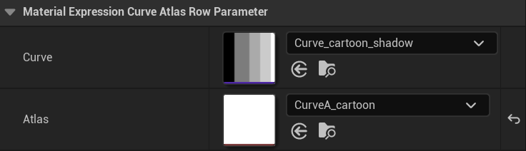随后回到材质编辑器,选择CurveAtlasRowParameter节点,添加刚刚的两个资产就行: