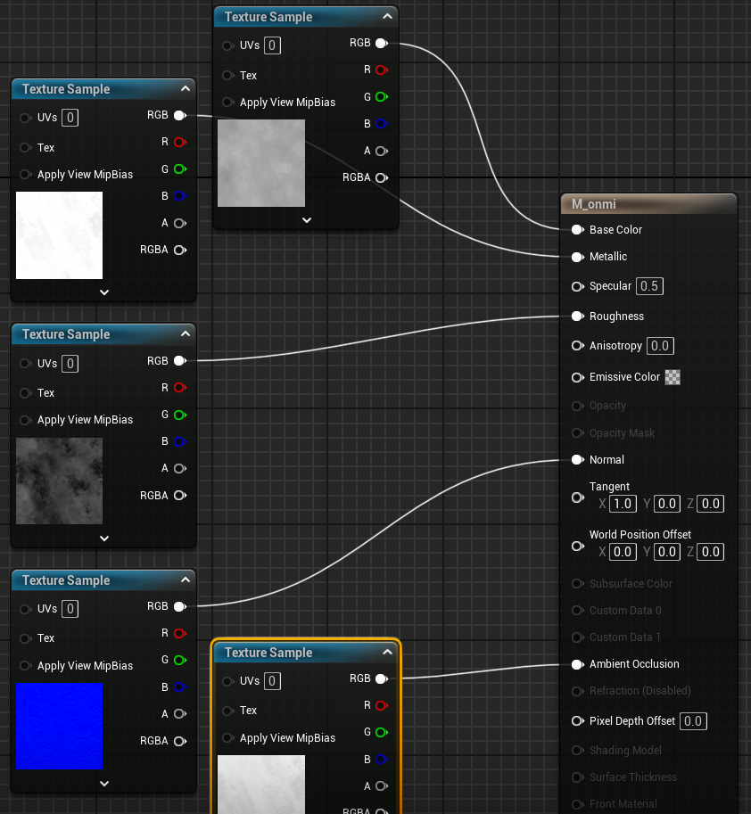 默认创建的材质是"Surface+Opaque+Default Lit",即最常用的不透明默认光照材质,右键搜索“TextureSample”创建纹理采样节点,或者直接从内容浏览器拖入纹理,连接一些常用的材质通道,应该是比较直观的