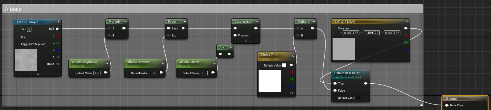 所有节点都可以右键搜索找到,其中的"Param"节点为常量参数节点,搜索"constant"以添加,并在节点上“右键->Convert to Parameter”转换为参数,然后这个参数就可以在窗口中看到,并在材质实例中调节(在内容浏览器对材质“右键->Create Material Instance”创建此材质的实例):
