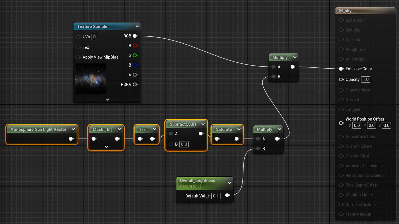 首先,创建一个用于天空球的材质M_Sky,选择Blend Mode为Additive,这样在黑夜时能自然的过度为星空,选择Shading Model为Unlit,因为天空盒并不需要被光照,并勾选Two Sided以在球体内部可见,然后简单连接为下面的样子: