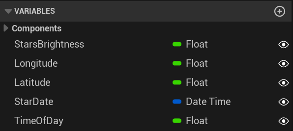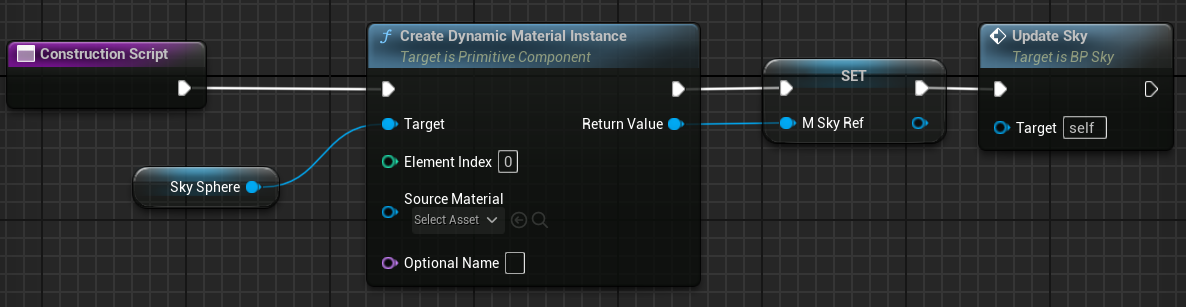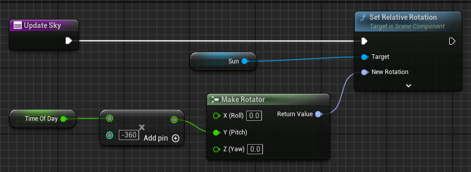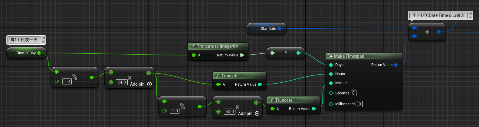 随后修改蓝图函数Update Sky,先将每天的时间和星象日期相加(DateTime结构体本身可以设置每天的时间,不过比较麻烦,还是用TimeOfDay变量来修改每日时间):