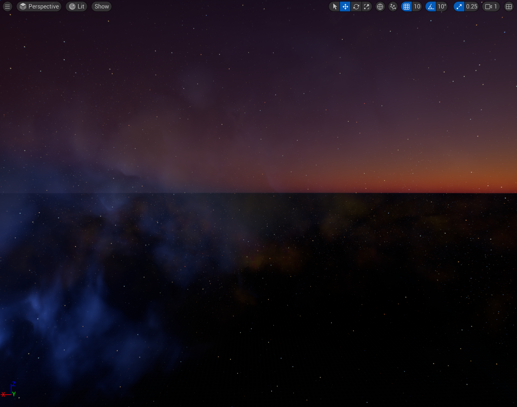 在这个例子当中,我们尝试创建一个自定义的环境光照系统,使用UE5提供的环境光组件用于白天的照明,并在夜晚切换为动态的星象球。涉及到动态材质实例(Dynamic Material Instance)和 蓝图函数库 (Blueprint Function Library) 等内容