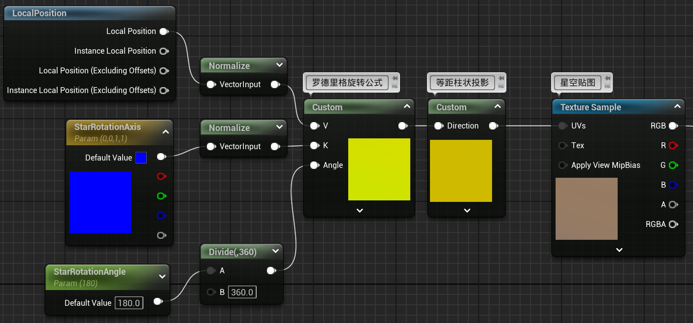 首先修改材质M_Sky,我们的需求是,球上的贴图能绕某个空间中的轴(StarRotationAxis)旋转一定角度(StarRotationAngle),没有自带的节点能够做到这一点,但由于球体的默认UV为等距柱状投影,所以可以手动计算。我们拿到天空球表面点的坐标,使用罗德里格旋转公式后,手动计算等距柱状投影后的UV: