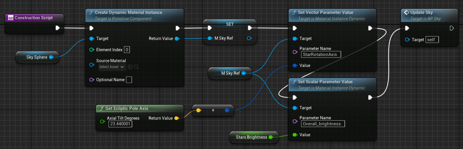 有了这几个工具函数,剩下的就很简单了,首先在BP_Sky的构造函数中,由于黄赤交角为固定值(地球为约23.44度),计算出天球的旋转轴,并修改对应的材质参数