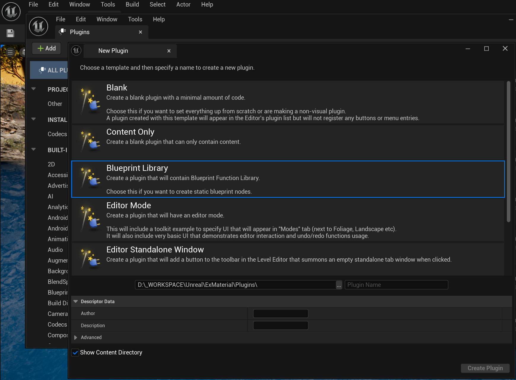 Edit->Plugins->Add->Blueprint Library,输入一个名称例如ShaderPathPlugin并点击创建