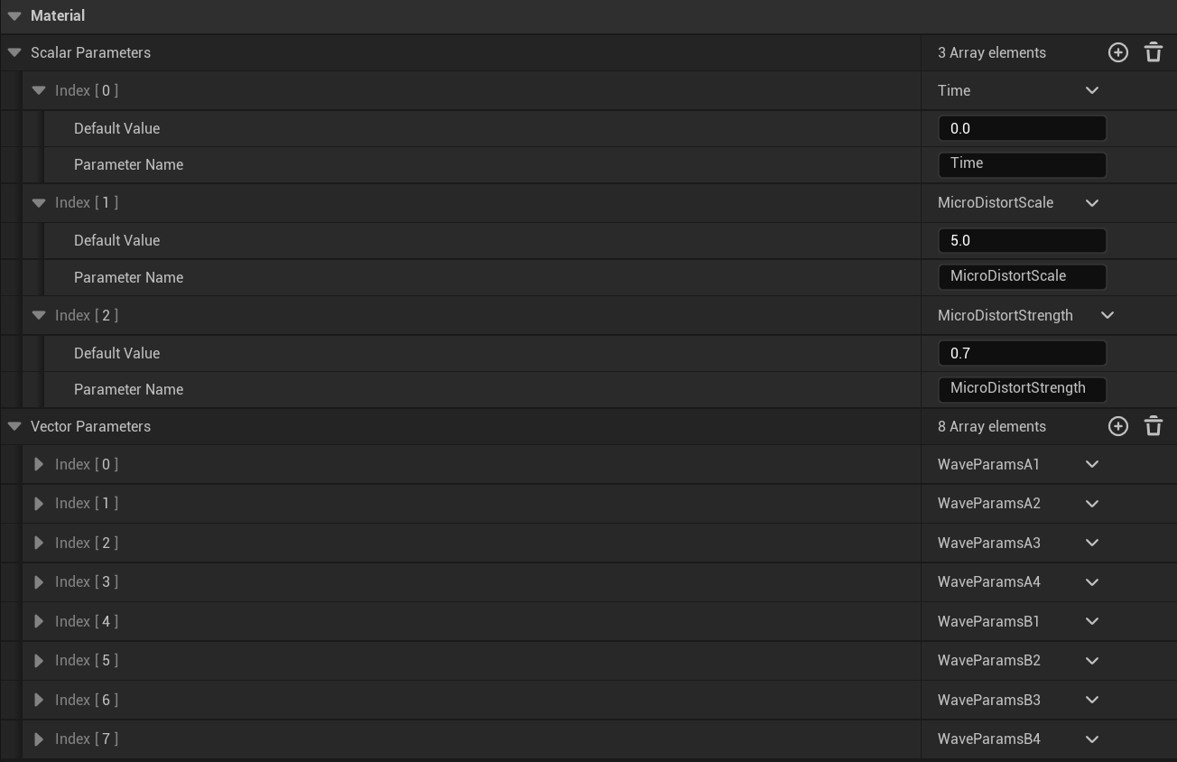 - GPU通道 (渲染): 对于所有材质(水面、水下焦散),最佳选择是 RenderTarget (RT),将水面的World Position Offset计算到一张贴图中,然后在材质中采样,可以避免重复计算,但对于目前这个例子来说有些没必要,下一章会重点讲解。这里就先简单用 UMaterialParameterCollection (MPC),UWaterWorldSubsystem会在每一帧更新这个MPC,将波浪参数(如时间、风向、波长、振幅等)推送到GPU,然后重复用相同的算法计算波。所有相关的材质都从这个MPC中读取数据,保证了视觉上的同步
