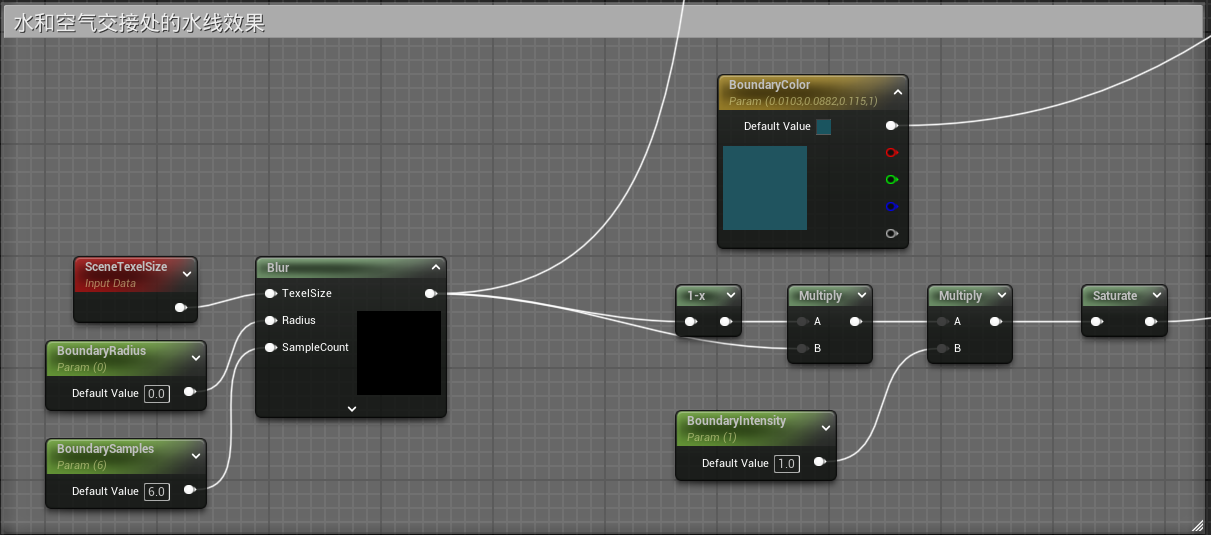 这个系统相较于上面的天空系统会复杂很多,我们先简单拆解每一个部分。首先是水面材质,通常使用单层水着色模型,拆解一下就是: